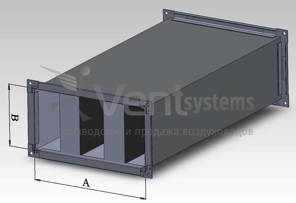 - Шумоглушители для прямоугольных воздуховодов представляют собой две вдетые друг в друга трубы круглого или прямоугольного сечения. Между ними размещается звукопоглощающий материал.